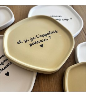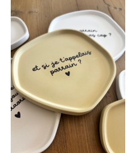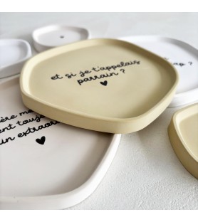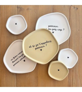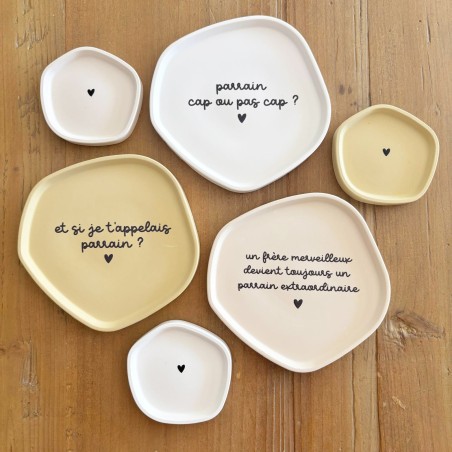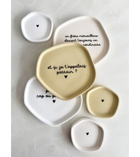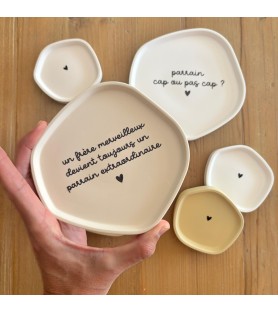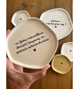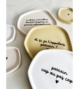 Coupelles en résine naturelle, disponibles en trois coloris et avec différents textes pour parrain. Une idée cadeau unique, faite à la main, pour une demande de parrain ou un remerciement original.