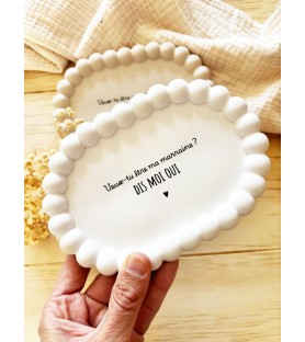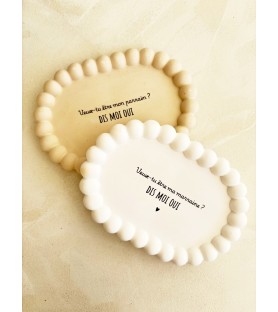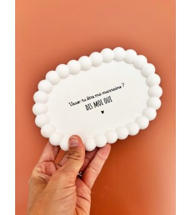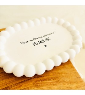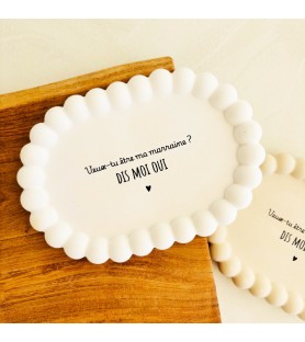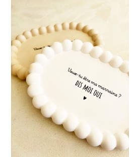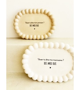Une élégante coupelle ovale en résine naturelle, disponible en blanc ou beige, pour une demande de parrain ou de marraine tendre et inoubliable. Idéale aussi comme vide-poche, repose-bijoux ou objet déco.