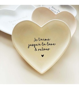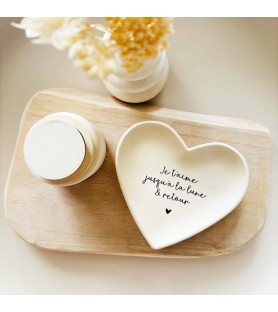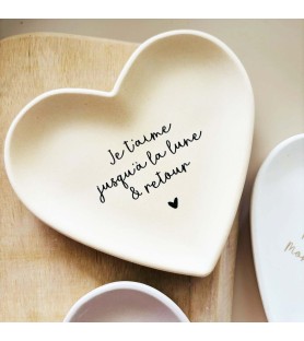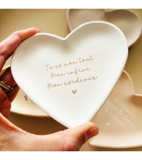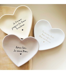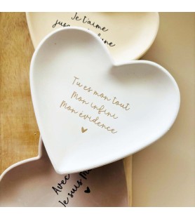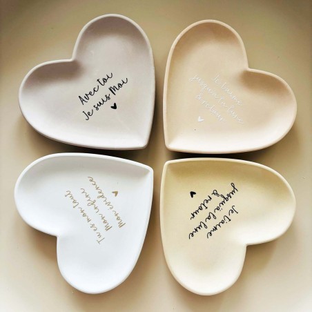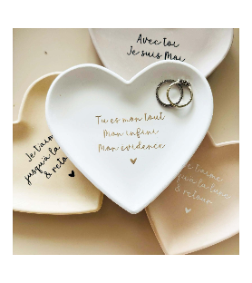 Cette coupelle en forme de cœur a été imaginée comme un objet porteur de sens, destiné à transmettre des émotions sincères. Chaque message inscrit évoque un lien fort, une complicité ou une promesse, et transforme cette création en une déclaration douce et intemporelle. Elle est idéale pour offrir à l’occasion de la Saint-Valentin, d’un anniversaire ou simplement pour dire je t’aime.