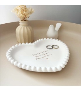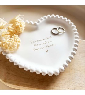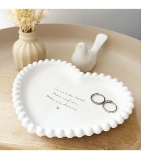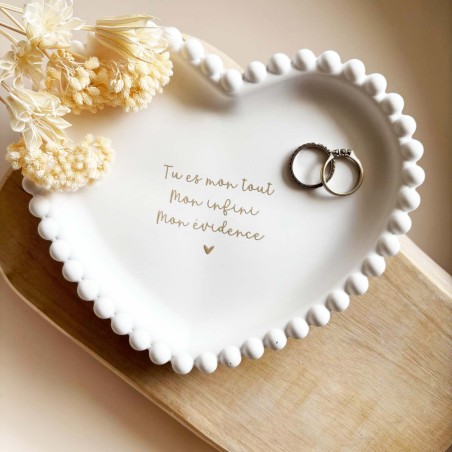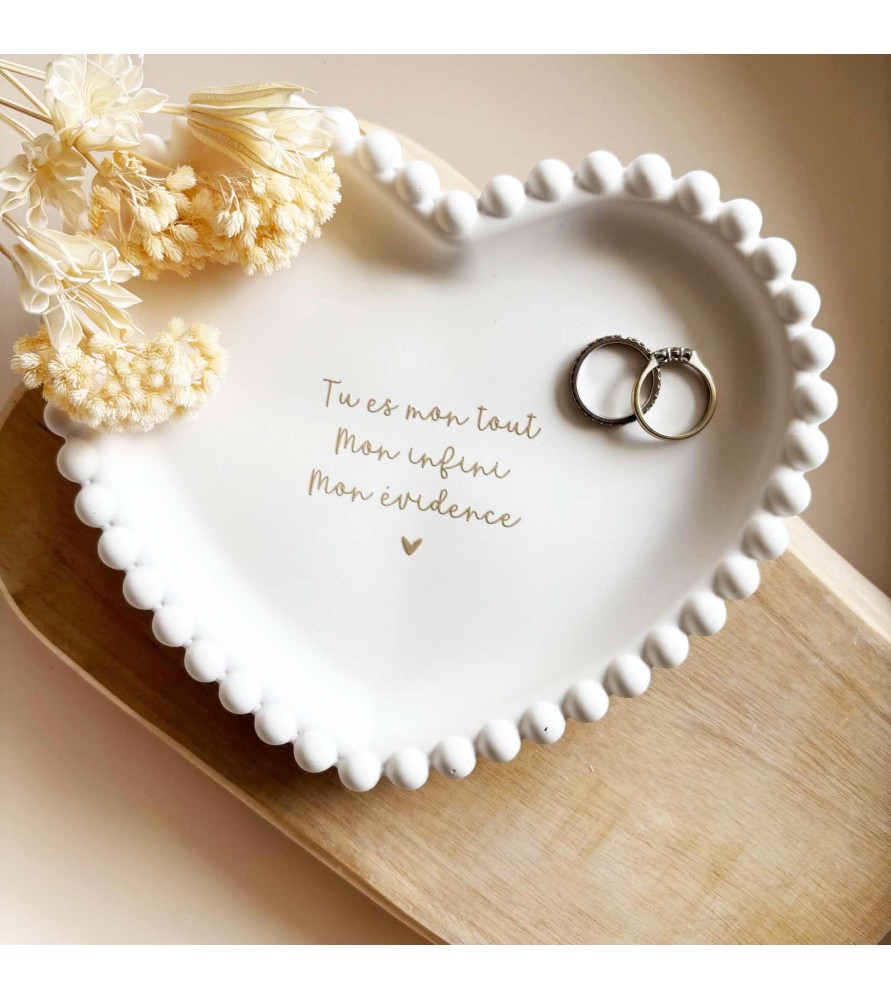 Cette coupelle décorative en forme de cœur est une véritable déclaration d’amour, pensée pour célébrer les liens forts et sincères. Son message « Tu es mon tout, mon infini, mon évidence », inscrit en beige doré à l’intérieur, exprime avec douceur et élégance un sentiment profond et intemporel. Son contour perlé apporte une touche raffinée et délicate, faisant de cette pièce un objet décoratif aussi poétique qu’élégant.