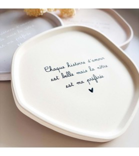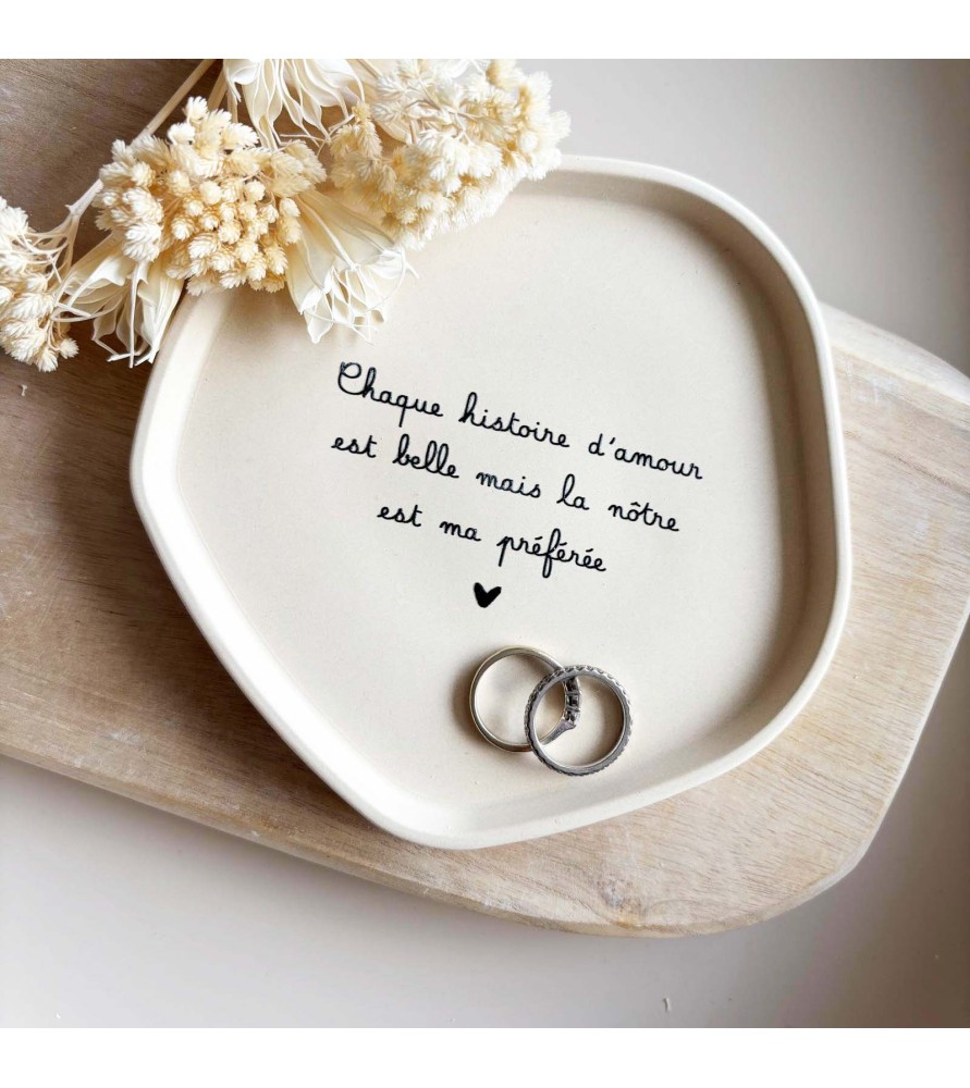 Cette coupelle décorative est une ode à l’amour et aux histoires uniques. Le message « Chaque histoire d’amour est belle, mais la nôtre est ma préférée » est inscrit avec finesse au centre, apportant une touche poétique et sincère à cet objet du quotidien. Son design épuré et ses teintes chaleureuses en font une pièce facile à intégrer dans tous les intérieurs, qu’ils soient modernes, bohèmes ou minimalistes.