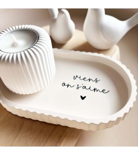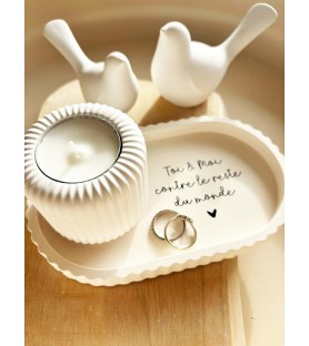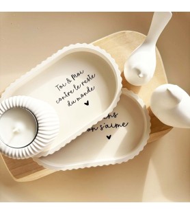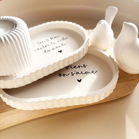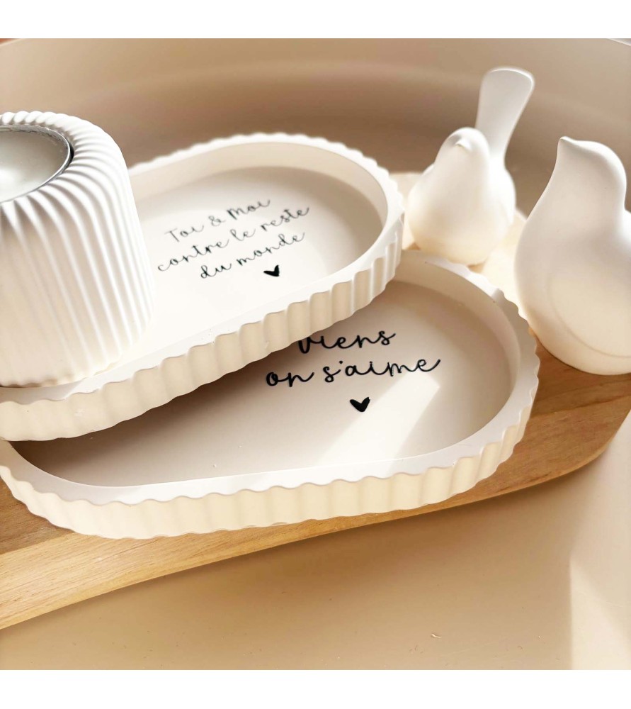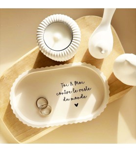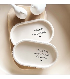 La coupelle, aux lignes douces et aux bords subtilement ondulés, est proposée en teinte beige naturelle. Elle est disponible avec deux messages inscrits en noir : « Toi et moi contre le reste du monde » ou « Viens on s’aime ». Des phrases fortes et tendres à la fois, parfaites pour symboliser un lien unique.