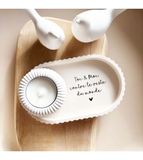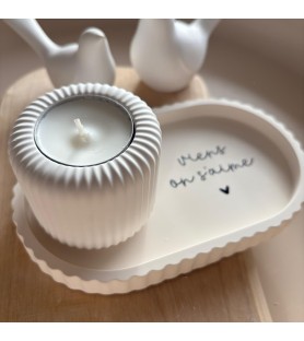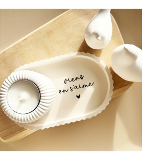 Ensemble décoratif composé d’une coupelle ovale en résine naturelle avec message d’amour et d’un photophore blanc strié pour bougie chauffe-plat. Une création artisanale douce et symbolique, idéale pour un cadeau ou pour sublimer un intérieur.