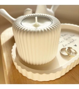 Le photophore blanc strié est conçu pour recevoir une petite bougie chauffe-plat et est livré avec sa bougie. Fabriqué lui aussi à la main, il diffuse une lumière douce qui met en valeur la matière et le message de la coupelle. Comme toutes les créations Atelier Roz & Lou, il est réalisé en sulfate de calcium, une résine naturelle qui ne supporte pas le contact prolongé avec l’eau.